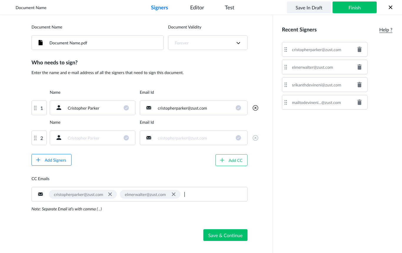Signatures with Zust Sign are the most effective and compliant means of digital signatures. You can now loop people from within and outside your organisation to complete digital signatures and audit trail such eSignatures coherently.